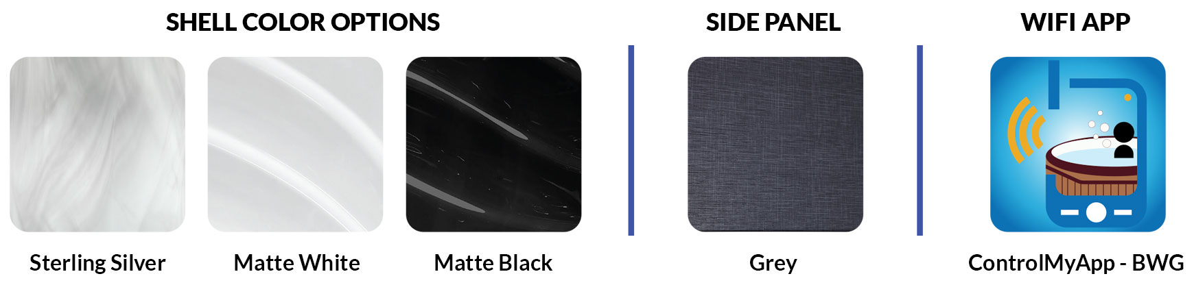 Bluetooth Sound System Individual Seat Pressure Controls Stainless Steel Jet Casings Superior Aristech Acrylic Finish Hand Rolled Fiberglass Shell Three Color Choices No Maintenance Cabinet High Impact Moulded ABS Base No Kink PVC Plumbing Underwater Flood Lighting Waterline Lighting Ozone Water Clarifying System High Density Lockable Spa Cover Premium Multi-layer Insulation Balboa Control Panel WiFi App Remote Control (Add-on, Extra Cost)